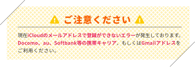 icloudアドレスは非対応、またGmailアドレスをご利用の場合、エントリー用の返信メールが迷惑メールフォルダに届くことがございます。